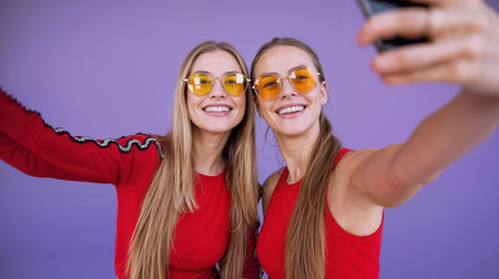Two girls in red shirts and yellow sunglasses take a selfie on a purple background