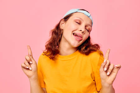 cheerful woman in a yellow t-shirt and blue cap posing emotions cropped view unaltered