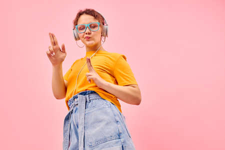 beautiful woman yellow t-shirt headphones entertainment music fun pink background unaltered