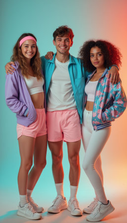Three fashionable young adults pose confidently in bright colored sporty jackets, exuding contemporary style and unity within a lush tropical outdoor environment, emphasizing youthfulness, friendship, and bold fashion choices.