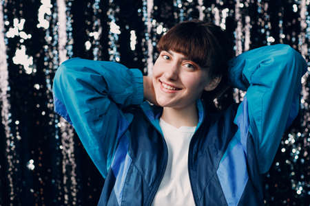 Young sporty woman 80 and 90s style. 90s fashion positive girl at disco party