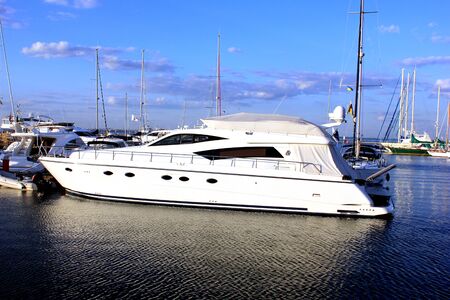 A luxury motor yacht in sea marina bay. Yacht in boat harbor. Private luxury boat for best summer vacation. Summer boat vacation. Boat yachting. Yacht vacation in summer. Marina bay. Marina club