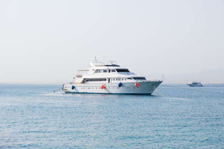 Cruise liner with tourists sailing on Red Sea. Sea voyage on white boat. Cruise ship with tourists on Sea. Mass tourism on sea