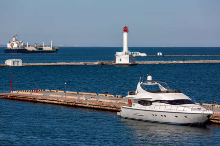 the motor yacht moored at the seaport mooring against the background of a beacon and the gas carrier cargoship taking to the open sea.
