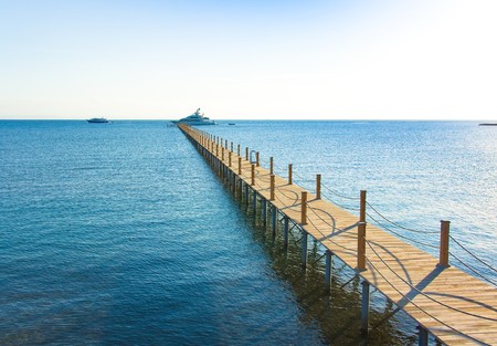Wooden decking or walkway and view of yacht standing at the marina in Phuket, Thailand