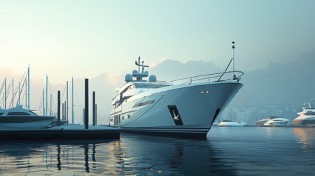 A sleek luxury yacht rests calmly at a marina, surrounded by smaller boats. The atmosphere is tranquil, with soft twilight lighting enhancing the scene's elegance.