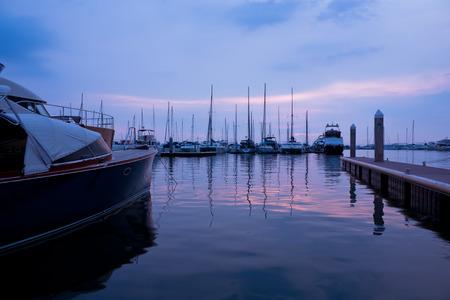 Beautiful view of marina and harbor with yachts and motorboats. Sunset at the ocean. Background