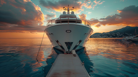 Luxurious yacht docked at an exclusive marina, deep blue sea stretching beyond.