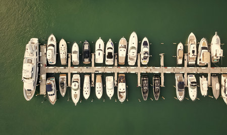 Yachts and boats moored in the marina. Aerial view.