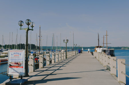 Sailboat moored to a pier in a yacht marina after winterization. Vacations, transportation, sport, recreation, tourism, cruise, port service