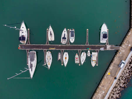 Group of sailing boats anchoring in marina next to jetty wooden pier. Aerial photo, high angle of view, bird eye perspective