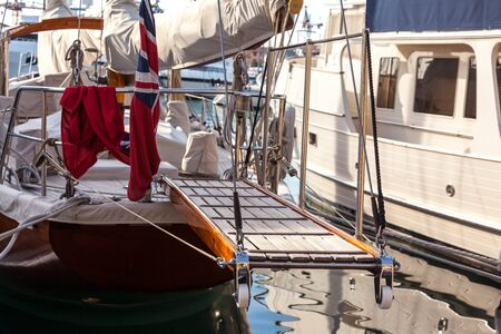 wooden gangway on marine yacht staying in port. luxury tourism