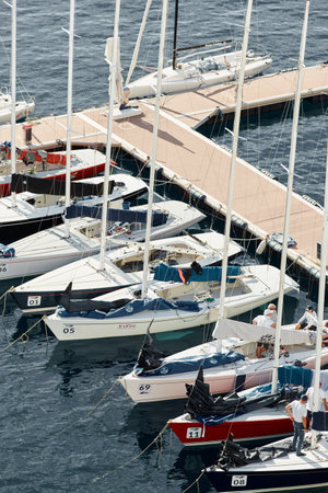 Monaco, Monte-Carlo, 29 September 2022: a lot of sail boats are moored in the new Yacht Club at sunny day, no wind, teams is waiting race, port Hercules, bow with sails