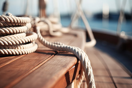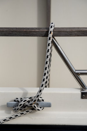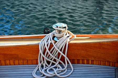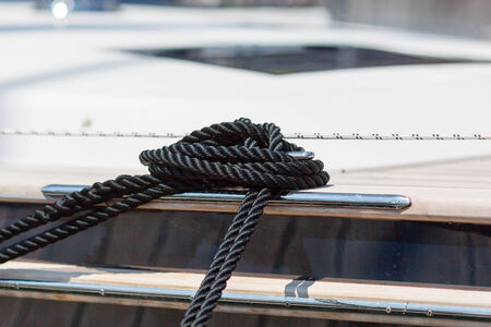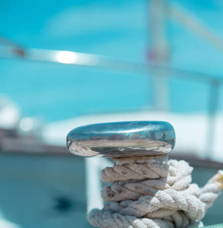 Detail of a mooring rope placed on sailing boat yacht desk. Leasure activities and extreme sport. Low depth of focus.