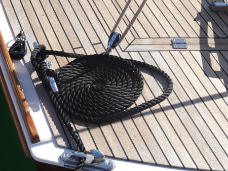 Coiled nautical rope beside mooring cleats on a classic sailing yacht deck