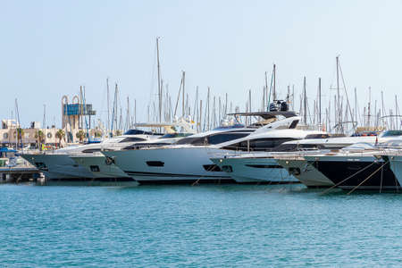 Marine parking of modern motor boats. Luxury yachts docked in sea port.