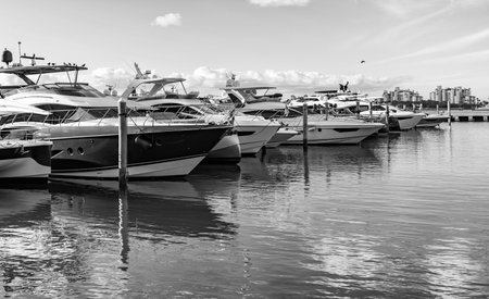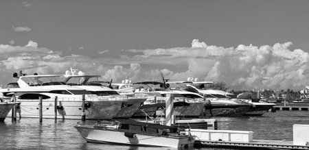 Luxury yacht boat moored at harbor pier in Miami beach summer marina, Florida