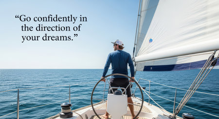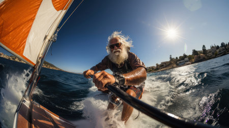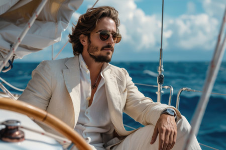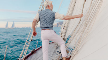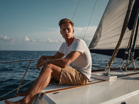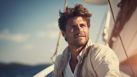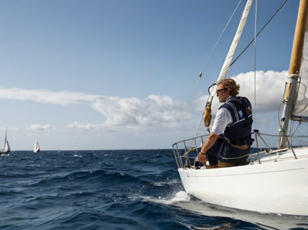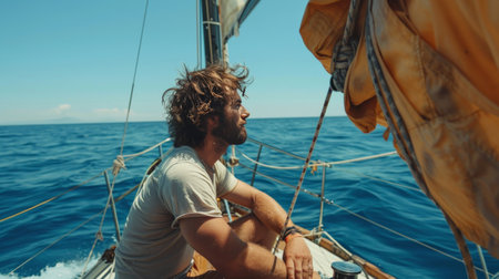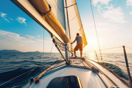 man skillfully navigates a sailboat on the open water, using his knowledge and experience to safely guide the vessel towards its destination. The wind fills the sails, propelling the boat forward as the man expertly adjusts the rigging and maneuvers the tiller. Generative AI