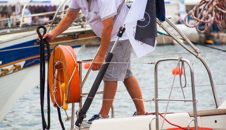 Focused sailor is adjusting the sails on a sailboat during a regatta competition