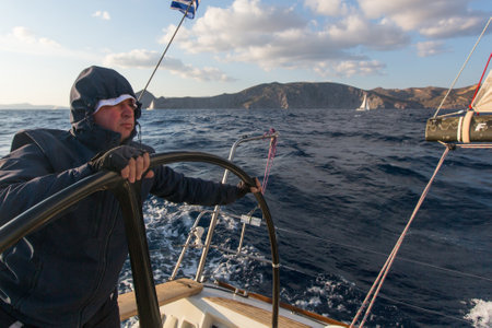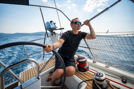 Man at the helm of a sailing yacht near Croatia, steering the boat through open water. Leadership, control, sailing lifestyle and freedom at sea. High quality photo