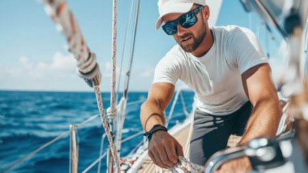 A man is focused on adjusting sailing ropes aboard a yacht. He wears sunglasses and is surrounded by vast blue sea and clear skies, reflecting a perfect day for sailing