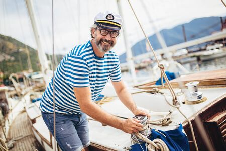 Portrait of a handsome mature man sailing on a yacht in the sea
