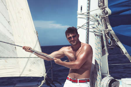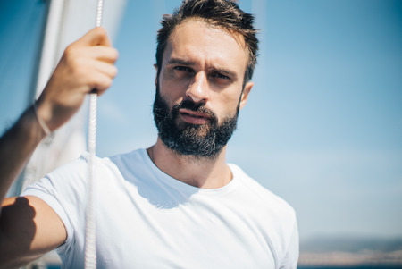 Young handsome hipster sailor man with fuzzy hairs sailing a boat to take his friends to a sea trip, looking at horizon, pulling the rope by a winch