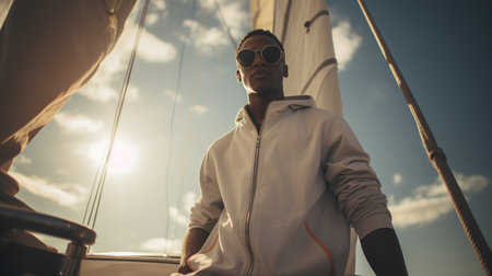 Attractive african american man in sunglasses and a white jacket on a yacht.