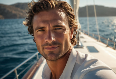 Man on a yacht with the ocean in the background, enjoying a sea voyage.