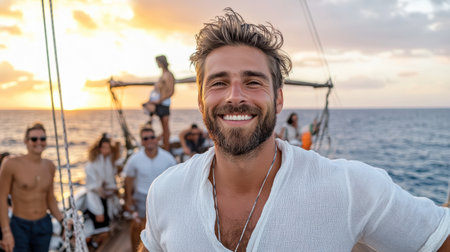 A man smiling on sailboat during beautiful sunset cruise with friends