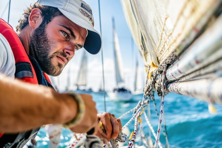 Sailor demonstrating precision in adjusting sail ropes olympic sailing sport concept