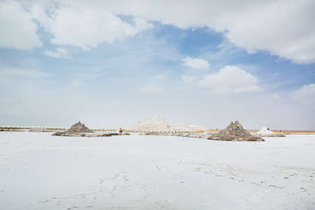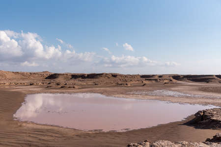 gathered water in a arid lake in dasht e lut or sahara desert with cloudy sky