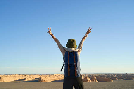rear view of asian woman backpacker looking at view of the yardang landform in gobi desert, arm outstretched