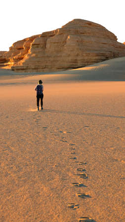 asian woman female tourist backpacker walking in desert leaving behind a string of footprints
