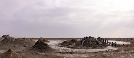 A group of tourists on mud volcanoes. Alyat. Azerbaijan.