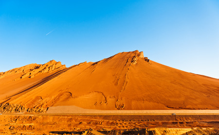 The Flaming Mountains are barren, eroded, red sandstone hills in Tian Shan Mountain range, Xinjiang, China