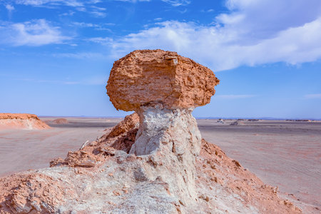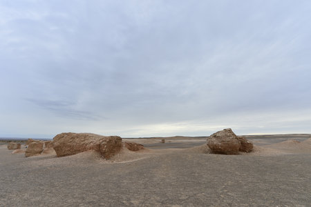 Cloudy, warm morning in the bizzare landscape of Lut desert, the hottest place on earth. Bizzare geological shapes rise from sand and dirt. Kerman Province, Iran.