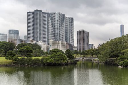 Toyo, Japen - April, 25, 2019: Beautiful Hamarikyu Gardens, large and attractive landscape garden in Chuo district, downtown Tokyo, with skyscrapers beyond.