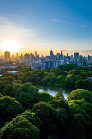 Experience an aerial view of a vibrant urban park nestled among towering skyscrapers, showcasing lush greenery, serene water bodies, and inviting pathways.
