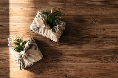 two pastel-colored furoshiki gifts and craft decor on on wooden background Beautiful gift wrapping and handicraft