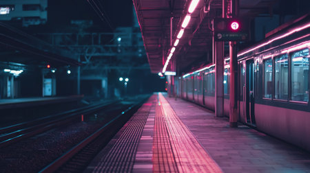 A captivating night scene at a train station, illuminated by neon lights, creating a futuristic and atmospheric ambiance.