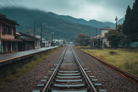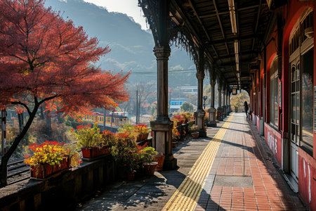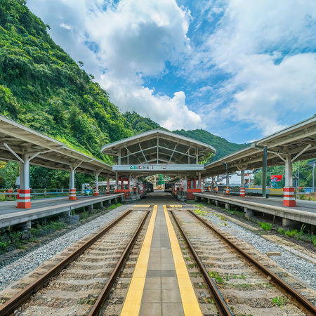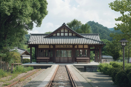 A quaint Japanese train station surrounded by lush greenery offers a peaceful setting for travelers.
