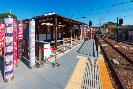 Fujiyoshida, Japan - NOV 30, 2018 : Shimoyoshida empty train station platform. Small train station on Tokyo - Kawaguchiko route tourist transit point for famous Chureito Pagoda and Mount Fuji view point.