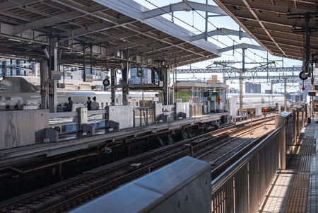 Daytime railway platforms at Shin Osaka Station with Shinkansen