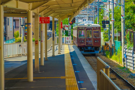 brown train stopping at the station. Shooting Location: Kobe City, Hyogo Prefecture
