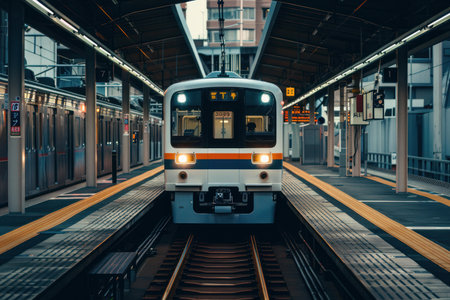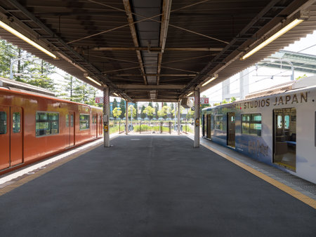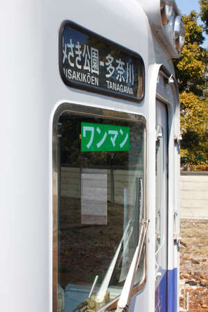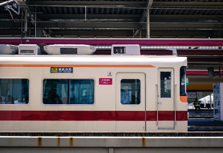 Ashikaga, Japan - May 20, 2017. Close-up of a train at railway station in Ashikaga, Japan. Railways are the most important means of passenger transportation in Japan.