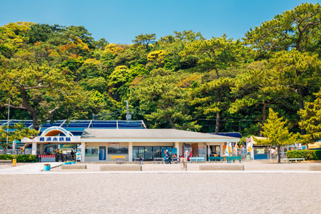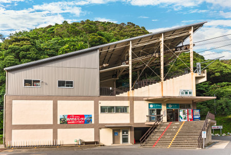 chiba, japan - july 18 2020: Nokogiriyama Sanroku Station building from which cable cars climbing to the Nokogiri Sancho Station at the top of the Mount Nokogiri stone quarry in Chiba prefecture.