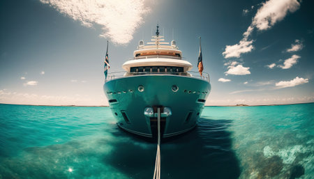 Low angle view on luxury yacht from the paradise turquoise ocean water surface. Sunny day in tropic sea. Generative AI.