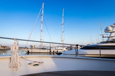 Side view of a stern trawl of beautiful motor white yacht moored to the pier