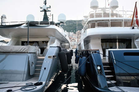 Moored yachts on the Mediterranean sea cost in Monaco, buildings on the background
